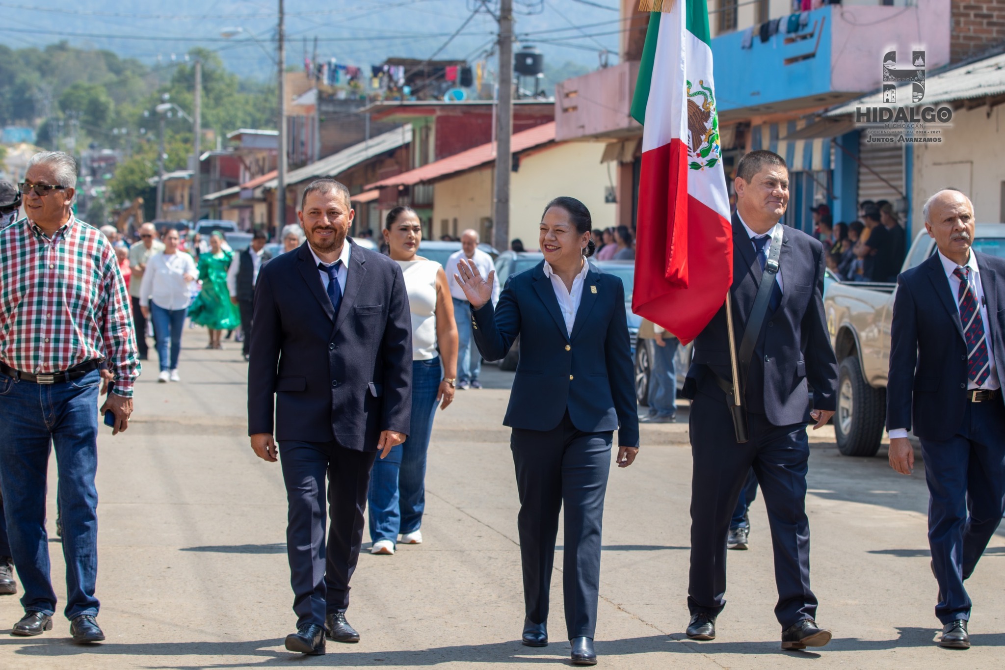 Ciudad Hidalgo, Michoacán., a 21 de mayo de 2025.- La Presidenta Municipal de Hidalgo, Jeovana Alcántar, acompañada del Jefe de Tenencia, Alejandro Pérez Rojas, Regidores y Funcionarios Municipales, maestros y alumnos de las diferentes instituciones educativas, encabezó el acto cívico conmemorativo del CII Aniversario de Elevación a Tenencia de San Antonio Villalongín, el evento se desarrollo en la Plaza Central de dicha localidad.